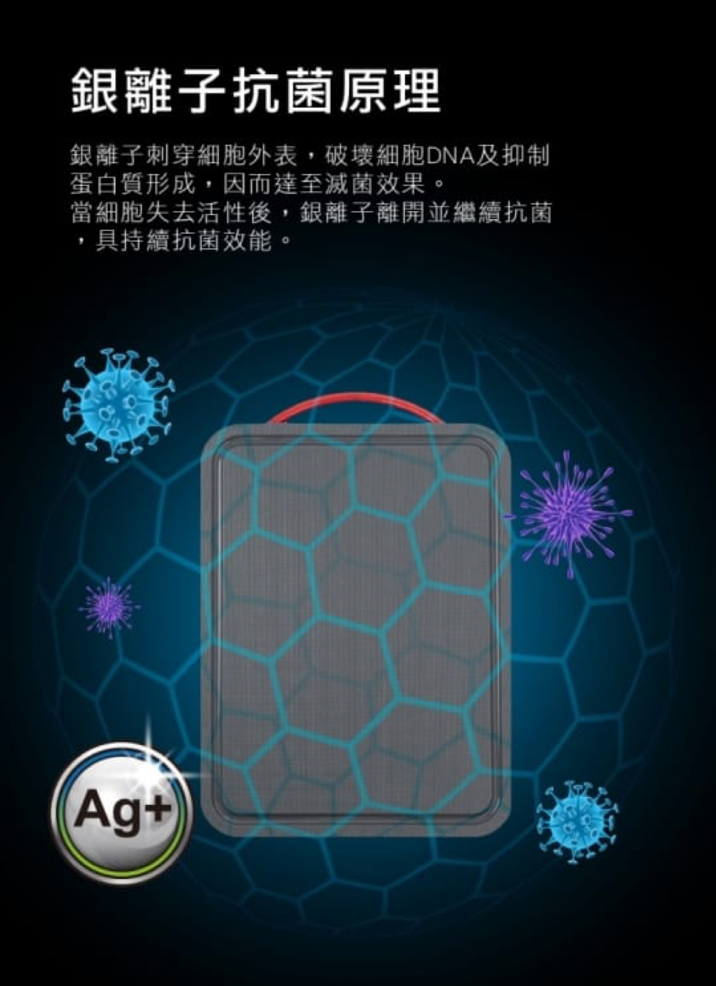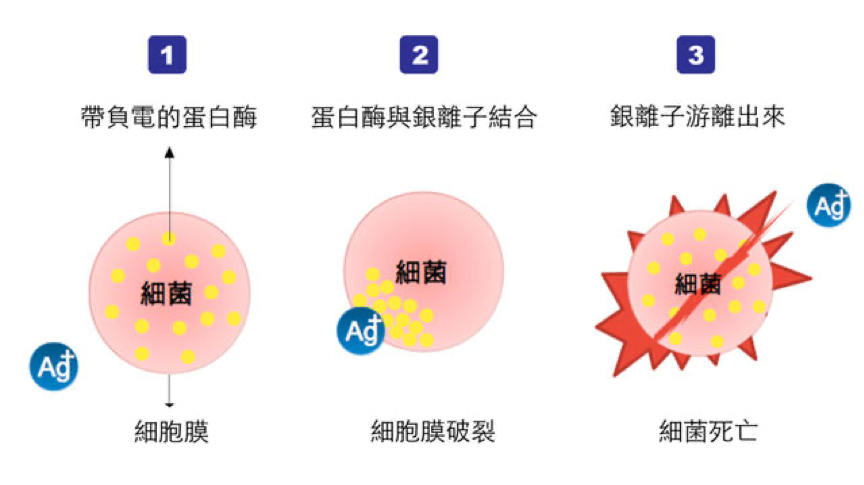銀離子刺穿細胞外表,破壞細胞DNA及抑制蛋白質形成讓細胞無法代謝及繁殖直至死亡,因而達至滅菌效果。