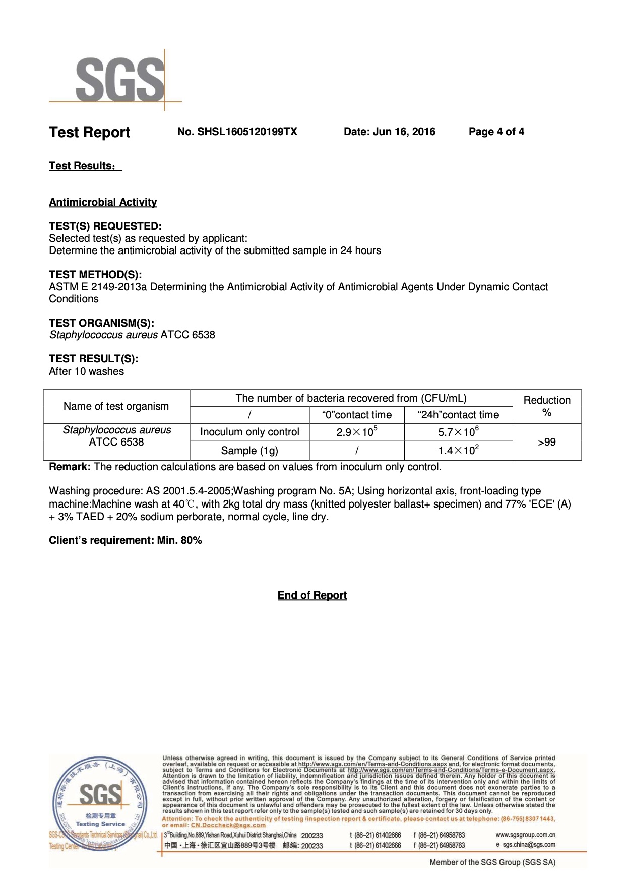 可以經受60°C 100次以上的洗滌,這已經被獨立的測試機構證實。 甚至可在40°C進行紡織品衛生清洗。 許多紡織品只能在40°C洗滌(包括其他人造纖維素纖維織物)。 然而對細菌來說,40°C時一個理想的生存環境。 這個溫度是細菌繁殖的最佳溫度,在通風較差的或高濕度的房間進行烘乾時,經常會有發黴的氣味產生就是這個道理。 40°C洗滌時,銀離子賦予織物抗菌和清新效果,遠離細菌,使消費者節約金錢和能源。